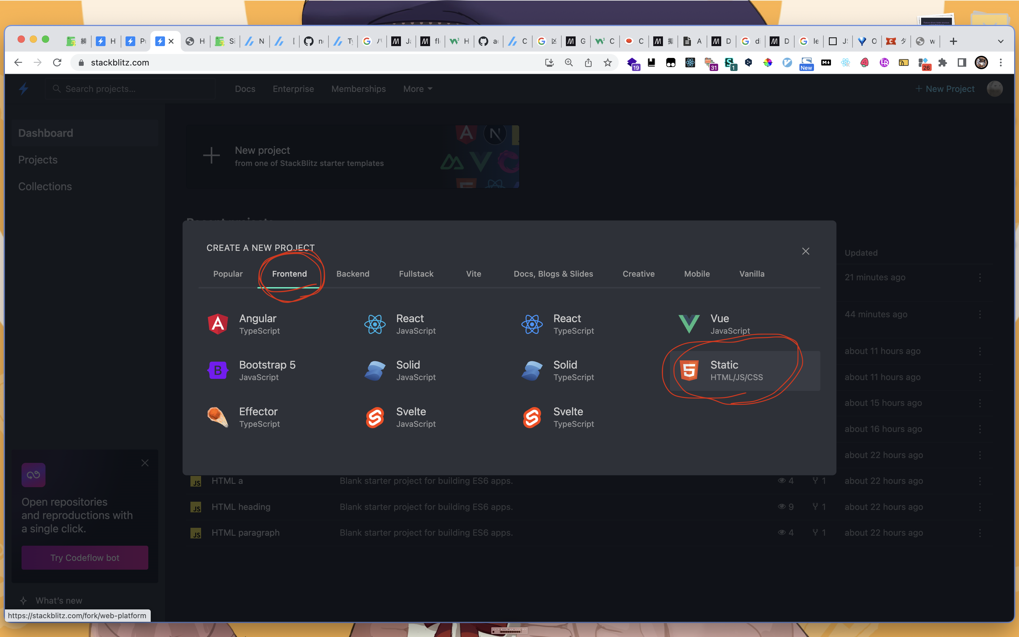 + New Project を押し、Frontendタブを選択、その中にあるStaticを選択してください。